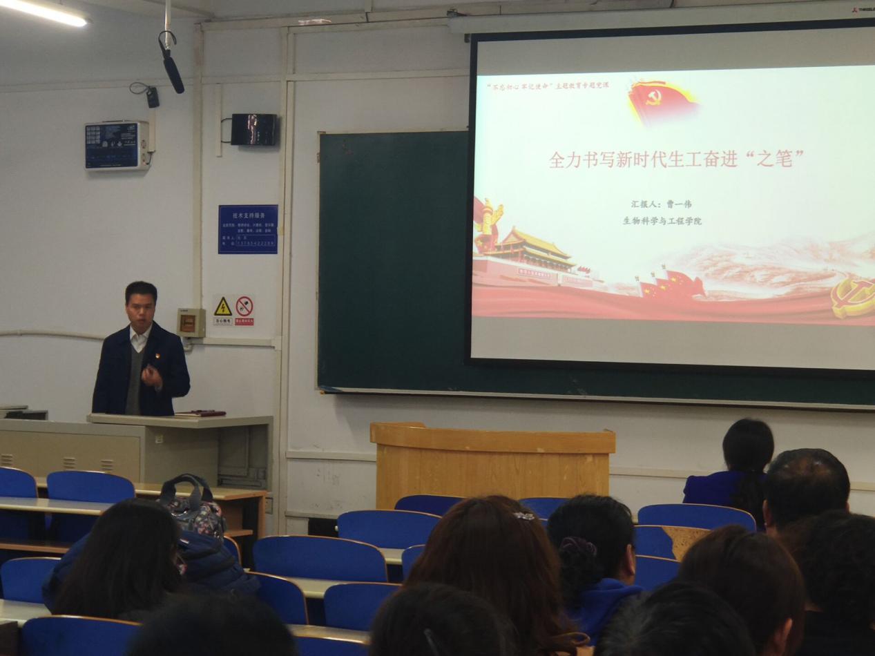 2019年10月21日下午,生物科学与工程公司党委书记曹一伟在第三教学楼A-201为全院老师做题为 “全力书写新时代生工奋进之笔”的主题党课,全院教师参加。