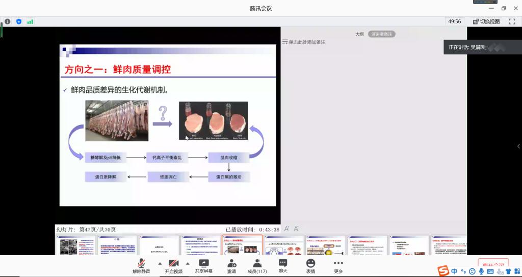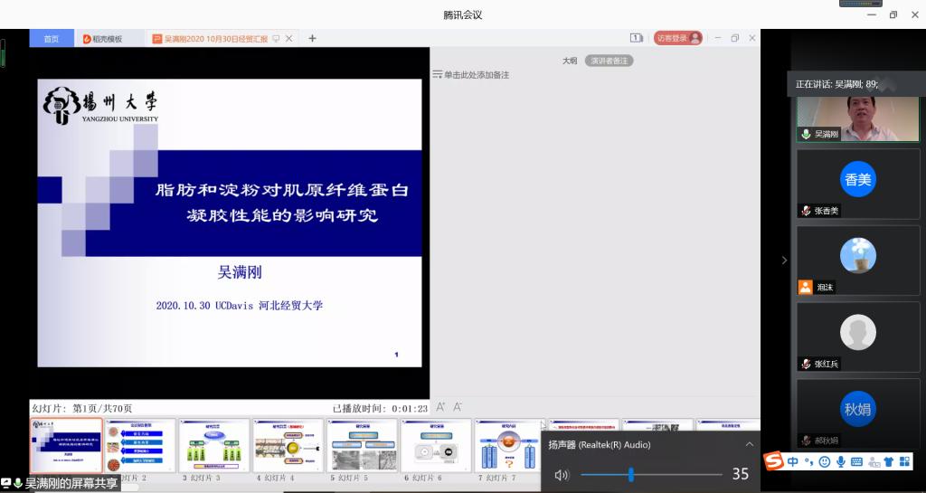 10月30日,正在美国加州大学戴维斯分校访学的扬州大学硕士生导师吴满刚副教授应tyc122ccvip邀请,于线上通过腾讯会议平台作了题为“脂肪和淀粉对肌原纤维蛋白凝胶性能的影响研究”的学术报告。报告由tyc122ccvip副经理张香美主持,学院百余名师生参加了此次报告会。