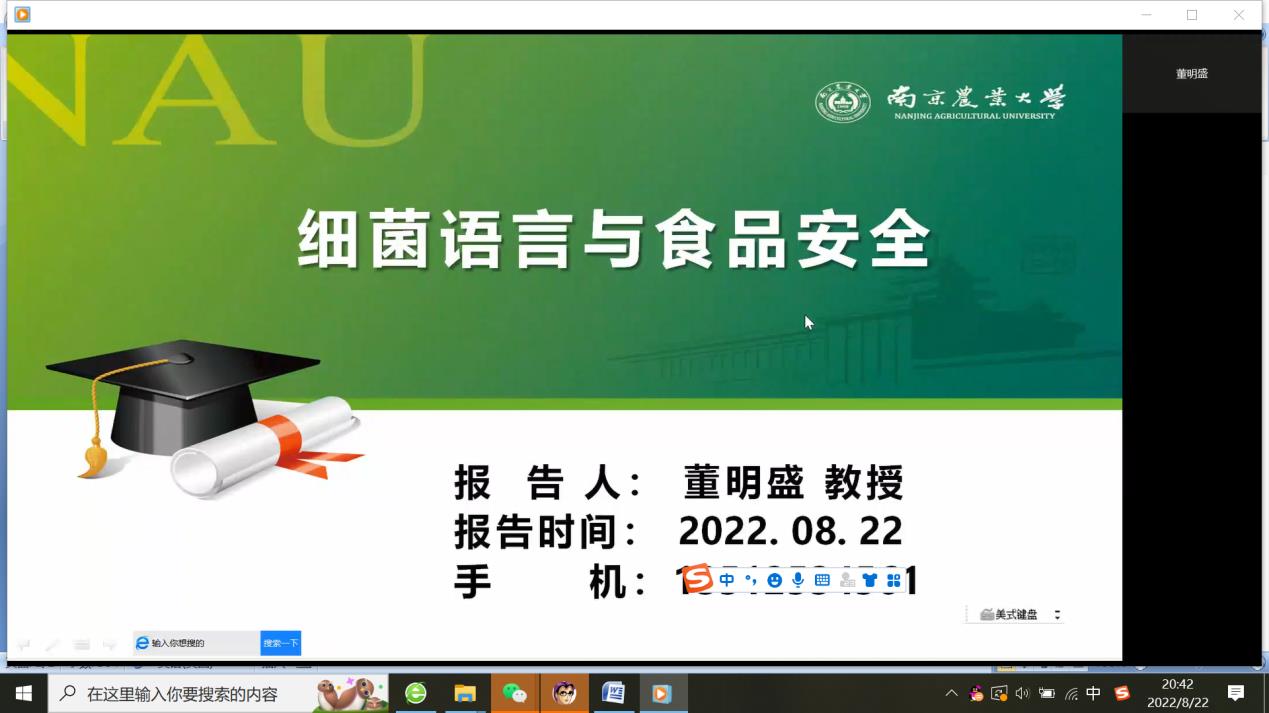 8月22日,应tyc122ccvip邀请,南京农业大学董明盛教授(博导)通过腾讯会议作了题为《细菌语言与食品安全(Quorum Sensing and Food Safety)》的学术报告。报告会由学院副经理张香美主持,学院教职工及员工110余人参加。
