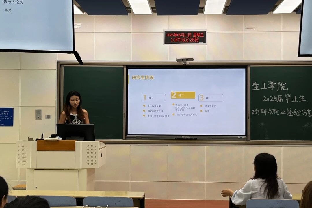 窦梦思同学以自身读研及就业经历为切入点,从研究生三年规划和就业准备两大方面进行了经验分享。在规划方面,她强调要以终为始,先熟悉学院毕业要求,再结合就业方向(如药企研发、考公等)有针对性地准备。在就业准备方面,她建议先明确方向,找好保底工作,表示自己在考公的过程中同时投递众多国企和银行岗位。最后她建议各位同学尽早做好准备,以免因准备时间较短导致复习紧张。